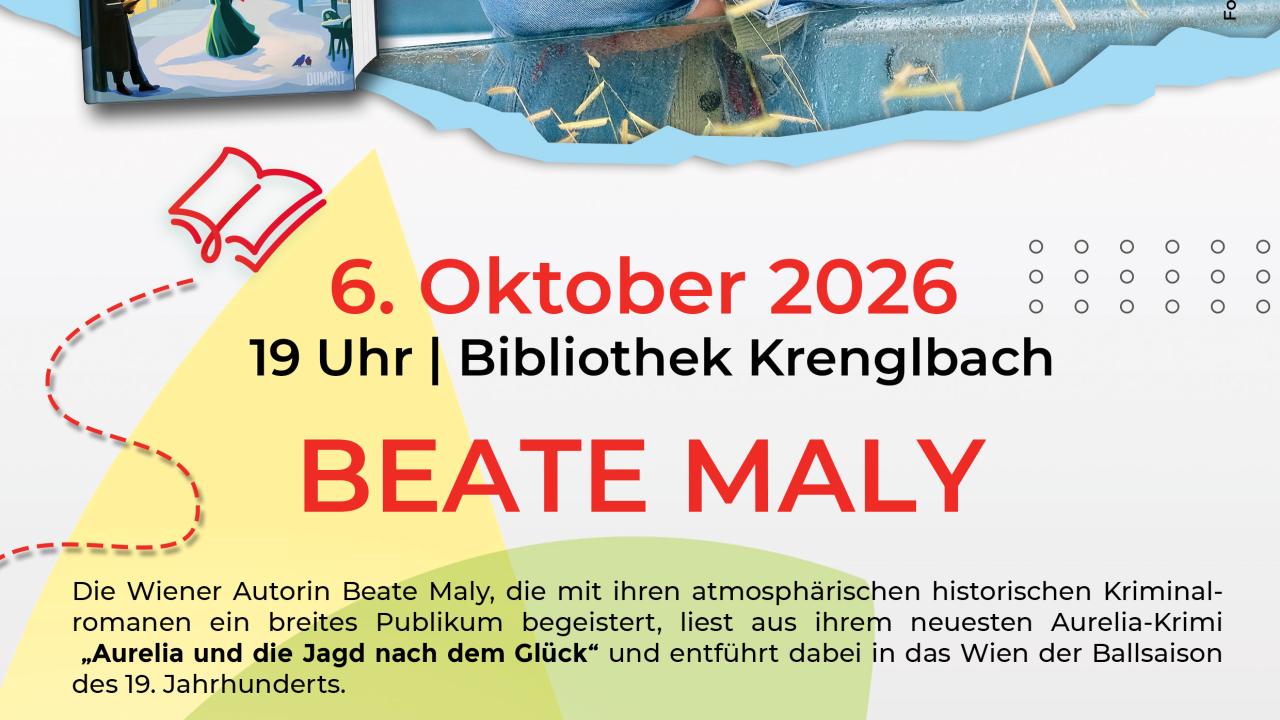 Die Bestsellerautorin Beate Maly liest aus Ihrem historischen Wien-Krimi "Aurelia und Jagd nach dem Glück". Wir freuen uns sehr auf diesen gemeinsamen Abend mit vielen KrenglbacherInnen.